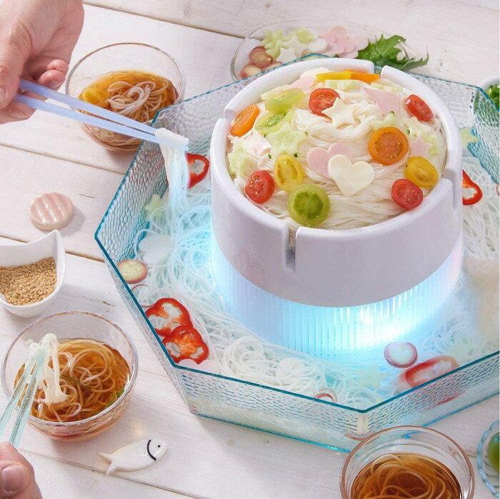 そうめんが流れる、光る ひんやりとした流しそうめんを楽しむ 製氷カップをいれて、ひんやりをキープ 昼でも夜でも流しそうめん LEDライト内蔵で、電源を入れるとカラフルに光る。