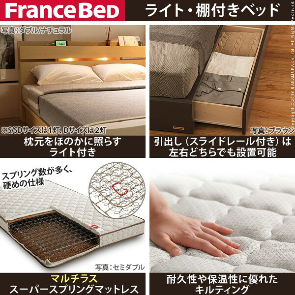 【9/4 20時開始 クーポン20%off】フランスベッド セミダブル 収納 ライト・棚付きベッド 〔ウォーレン〕 引出しタイプ セミダブル マルチラススーパースプリングマットレスセット 引き出し付き 木製 日本製 宮付き コンセントマットレス付き 引越し祝い 母の日