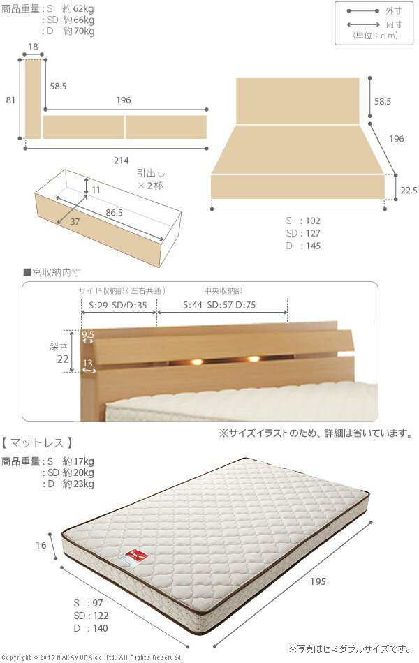 ●安心のメーカー2年保証 【セット構成】ベッドx1・マットレスx1 【カラー】ブラウン・ナチュラル 【仕様】 ■ベッド 本体:天然木化粧合板(ウエンジ/タモ)・ファインセラミック塗装、プリント紙化粧合板 床板:布張り コンセント:1口1500W コード長さ:約1.7m 照明:白熱灯1個10W(x1) 引出:スライドレール ◎組立品 ■マットレス 張地:ポリエステル64%、綿27%、レーヨン9% 中身:ウレタンフォーム、パームパッド、ポリエステル綿、防虫不織布 コイル:マルチラススーパースプリング 【サイズ】 ■ベッド 外寸:幅127x奥行214x高さ81cm/重量:約66kg 床面高さ:22.5cm 宮奥行:18cm 宮中央スペース:幅57x奥行9.5x高さ6/1cm 宮左右収納部分:幅35x奥行13/9.5x高さ22/17cm 引出内寸:幅86.5x奥行37x高さ11cm(x2杯) ■マットレス 外寸:幅122x奥行195x高さ16cm/重量:約20kg 株式会社ナカムラ(I-4700545)