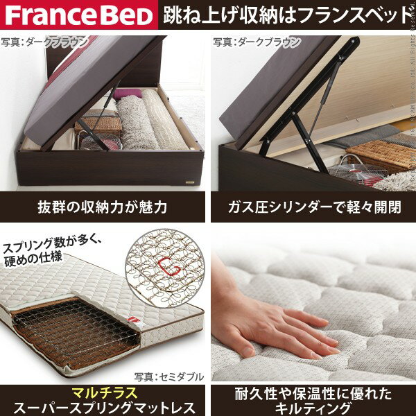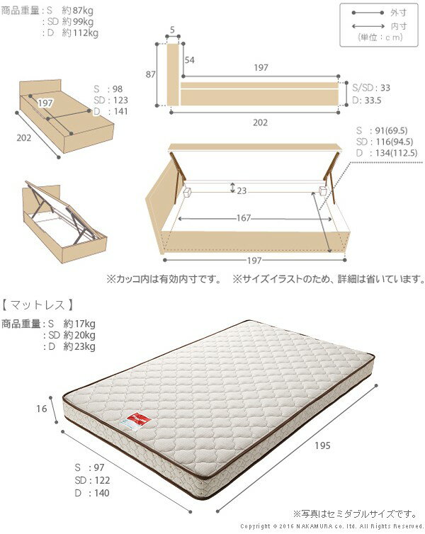 ●安心のメーカー2年保証 【セット構成】ベッドx1・マットレスx1 【カラー】ダークブラウン・ミディアムブラウン・ナチュラル 【仕様】 ■ベッド 本体:プリント紙化粧合板 床板:プリント紙化粧合板 跳ね上げ収納:ガススプリング ◎組立品 ■マットレス 張地:ポリエステル64%、綿27%、レーヨン9% 中身:ウレタンフォーム、パームパッド、ポリエステル綿、防虫不織布 コイル:マルチラススーパースプリング 【サイズ】 ■ベッド 外寸:幅123x奥行202x高さ87cm/重量:約99kg 床面高さ:33cm 宮奥行:5cm 跳ね上げ収納サイズ:幅94.5(最大116)x奥行167x高さ23(最大28)cm ■マットレス 外寸:幅122x奥行195x高さ16cm/重量:約20kg 株式会社ナカムラ(I-4700281)