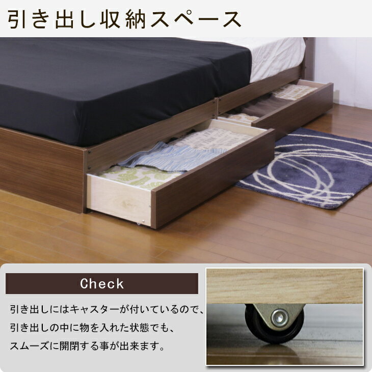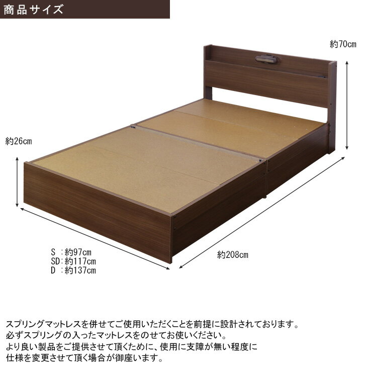 仕様詳細 ■製品寸法:レーム寸法/幅117×奥行208×高さ70cmMH約42cm引出し内寸/W約93×D約36×H約10cm 2杯マットレス寸法/幅120×奥行195×高さ17cm■製品の仕様:本体主材/プリント化粧板マットレス主材/2.1mmボンネルコイルスプリング(コイル数270個)、2.2mmポケットコイルスプリング(コイル数92個)、ウレタン、フェルト、ポリエステル、両面多針キルティング加工■生産国:ベッド本体/日本、マットレス/中国静止耐荷重:150Kg(厚さ15cm以上スプリングマットレス使用時)■カラーウォールナット・ナチュラル■備考厚さ15cm以上のスプリングマットレスを必ずのせてご利用ください。